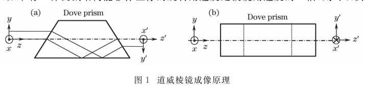 道威棱鏡是一種去掉頂端多余部分的直角棱鏡,當(dāng)光線從棱鏡的一端以平行棱鏡底面的方向平行入射時(shí),經(jīng)過(guò)兩次折射和一次反射后以同樣的方向平行射出。 圖1是道威棱鏡成像的原理。 在圖1(a)中,物體經(jīng)過(guò)道威棱鏡后,成的像是上下顛倒(即狔 方向發(fā)生改變);當(dāng)棱鏡繞光軸旋轉(zhuǎn)90°后,成的像左右顛倒(即狓方向發(fā)生改變),如圖1(b)所示。 也就是說(shuō),當(dāng)棱鏡繞光軸旋轉(zhuǎn)90°時(shí),成的像也繞光軸旋轉(zhuǎn),而且旋轉(zhuǎn)角度為180°。 所以,如果有一種機(jī)械結(jié)構(gòu)能夠保證像的旋轉(zhuǎn)角速度是棱鏡角速度的2倍,則可以實(shí)現(xiàn)消旋。
