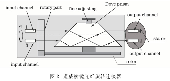 法國(guó)Thales公司 ThomasMerlet等在道威棱鏡的幾何中心開一小孔(或在幾何中心的入射面和出射面處切掉一小塊,使光能垂直玻璃表面入射和出射),光在該通道通過(guò)時(shí)不會(huì)發(fā)生偏轉(zhuǎn),因此通過(guò)道威棱鏡不會(huì)發(fā)生損耗,如圖3(b)所示。 對(duì)于一般的道威棱鏡滑環(huán)而言,因?yàn)榇嬖谥圃煺`差,在光學(xué)傳輸路徑上容易產(chǎn)生強(qiáng)度和長(zhǎng)度的波動(dòng),在旋轉(zhuǎn)過(guò)程中,棱鏡存在的同軸度誤差使插入損耗發(fā)生變化。 當(dāng)人們需要傳輸模擬信號(hào)時(shí),例如,連續(xù)數(shù)量的大幅度擺動(dòng)的信號(hào)時(shí),這些干擾將是致命的。 如果采用中心孔通道傳輸,就可以克服這些缺點(diǎn),同時(shí),其他的通道可以提供給那些對(duì)損耗變化不那么敏感的信號(hào)使用。