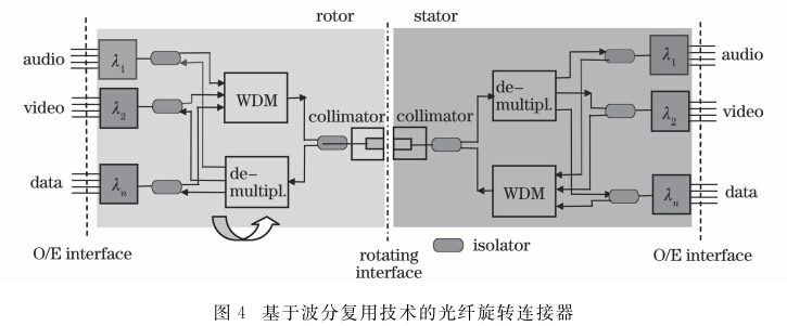 WDM 是同時(shí)將多個(gè)波長(zhǎng)的光在一根光纖中傳輸,提高了系統(tǒng)的傳輸容量,支持雙向信號(hào)傳輸。 利用WDM 這一技術(shù)特性,可構(gòu)成多通道光纖滑環(huán),實(shí)現(xiàn)大容量、低損耗和高速度數(shù)據(jù)傳輸。采用波分復(fù)用技術(shù)的多通道光纖滑環(huán)的結(jié)構(gòu)如圖4所示。 多束波長(zhǎng)分別為λ1,λ2 和λn 的光通過(guò)耦合隔離器(隔離器主要是防止從另一端反射回來(lái)的光束對(duì)入射光產(chǎn)生干擾),然后進(jìn)入波分復(fù)用器中,多束光被合成一束光。 這束光經(jīng)過(guò)微透鏡擴(kuò)束準(zhǔn)直后,通過(guò)連接器的旋轉(zhuǎn)界面。 在出射端,再通過(guò)微透鏡接收會(huì)聚,耦合到輸出端的解波分復(fù)用器(demultiplexer)中,由解分波復(fù)用器將一束光分解成多束光。 需要說(shuō)明的是,在這種對(duì)稱結(jié)構(gòu)中,光的傳輸是雙向的。 在實(shí)際應(yīng)用中,可以將音頻信號(hào)、視頻信號(hào)和數(shù)據(jù)等分別調(diào)制到不同的波長(zhǎng)上,