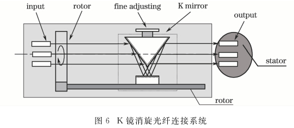 Moog公司利用45°反射鏡實(shí)現(xiàn)多路光纖信號(hào)的傳輸,如圖5所示。 圖中定子是固定不動(dòng)的,入射光纖的光經(jīng)過(guò)反射鏡反射后,進(jìn)入會(huì)聚透鏡,然后再通過(guò)光纖將光信號(hào)傳出。 反射鏡通過(guò)磁耦合齒輪與轉(zhuǎn)子連接,當(dāng)轉(zhuǎn)子轉(zhuǎn)動(dòng)時(shí),在磁力作用下,保持反射鏡不動(dòng),從而使光線始終與準(zhǔn)直透鏡相對(duì)。當(dāng)45°掃描鏡用于圖像傳輸時(shí),會(huì)產(chǎn)生像旋轉(zhuǎn)。 由于鏡面反射使得物與像的坐標(biāo)“顛倒”,所以奇數(shù)次反射成鏡像,而偶數(shù)次反射成物象。 Trex公司采用三反射面系統(tǒng)實(shí)現(xiàn)消除像偏轉(zhuǎn),因其三面反射鏡呈“K” 字排列,故起名“K 鏡”,如圖6所示。