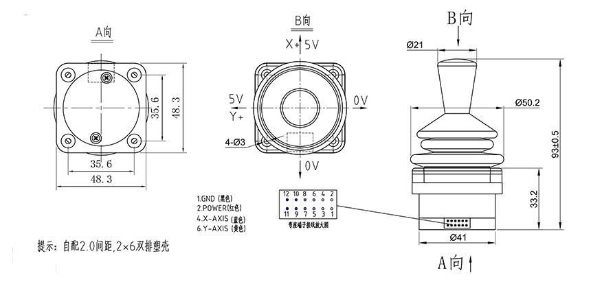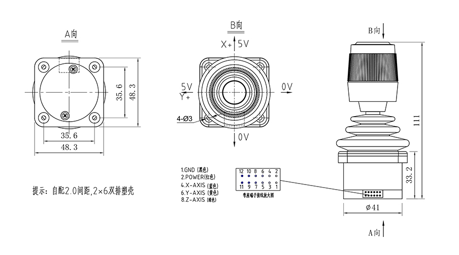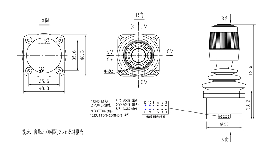導線顏色順序 紅色=5 VDC電源正極 黑色=電源負極 藍色=X軸 黃色=Y軸 綠色=Z軸 白色=開關 橙色=開關